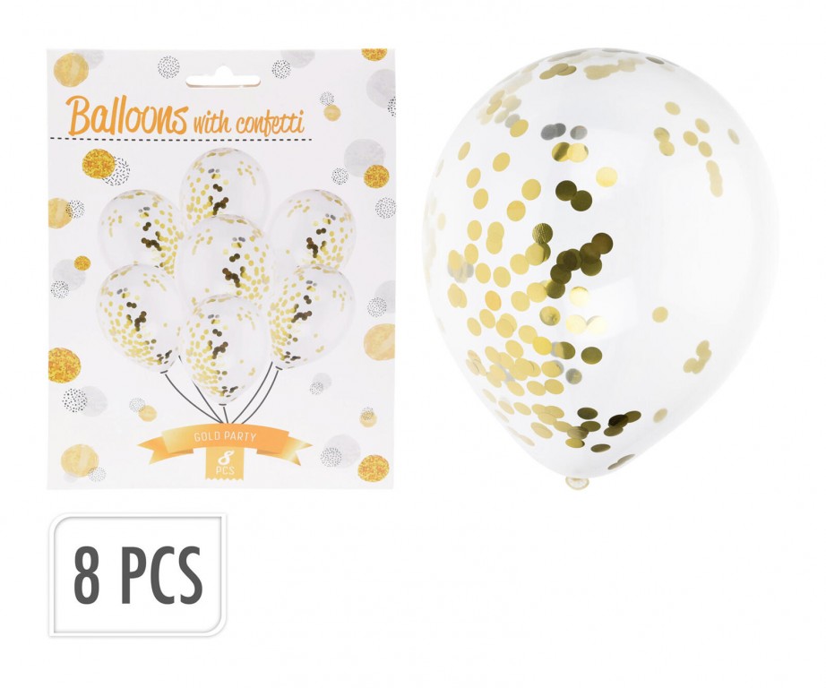 Balónky PÁRTY TRA BÍ / ZLA (8 ks). balení: 8 ks materiál: latex barva: transparentní bílá se zlatými konfetami Elegantní párty balónky jsou nepostradatelné na každé oslavě.