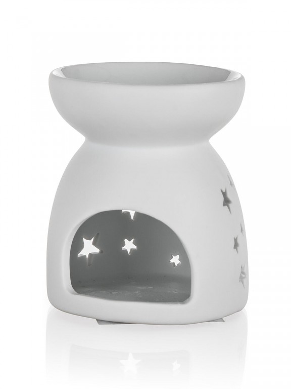 Porcelánová bílá aroma lampa 8 x 9 cm s dekorem hvězd má v dolní části prostor pro čajovou svíčku a nahoře mističku pro vonný olej nebo vonný vosk. Po zapálení čajové svíčky se postupně uvolňují vůně z oleje nebo vosku, které provoní interiér vašeho bytu. Čajová svíčka není součástí balení.