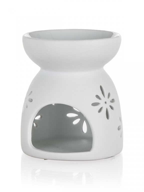 Porcelánová bílá aroma lampa 8 x 9 cm s dekorem vloček má v dolní části prostor pro čajovou svíčku a nahoře mističku pro vonný olej nebo vonný vosk. Po zapálení čajové svíčky se postupně uvolňují vůně z oleje nebo vosku, které provoní interiér vašeho bytu. Čajová svíčka není součástí balení.